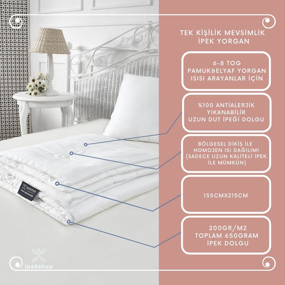İpek yorgan, doğal yapısı alerjen barındırmayan, dört mevsim kullanılabilen, en konforlu ve kaliteli yorgandır.