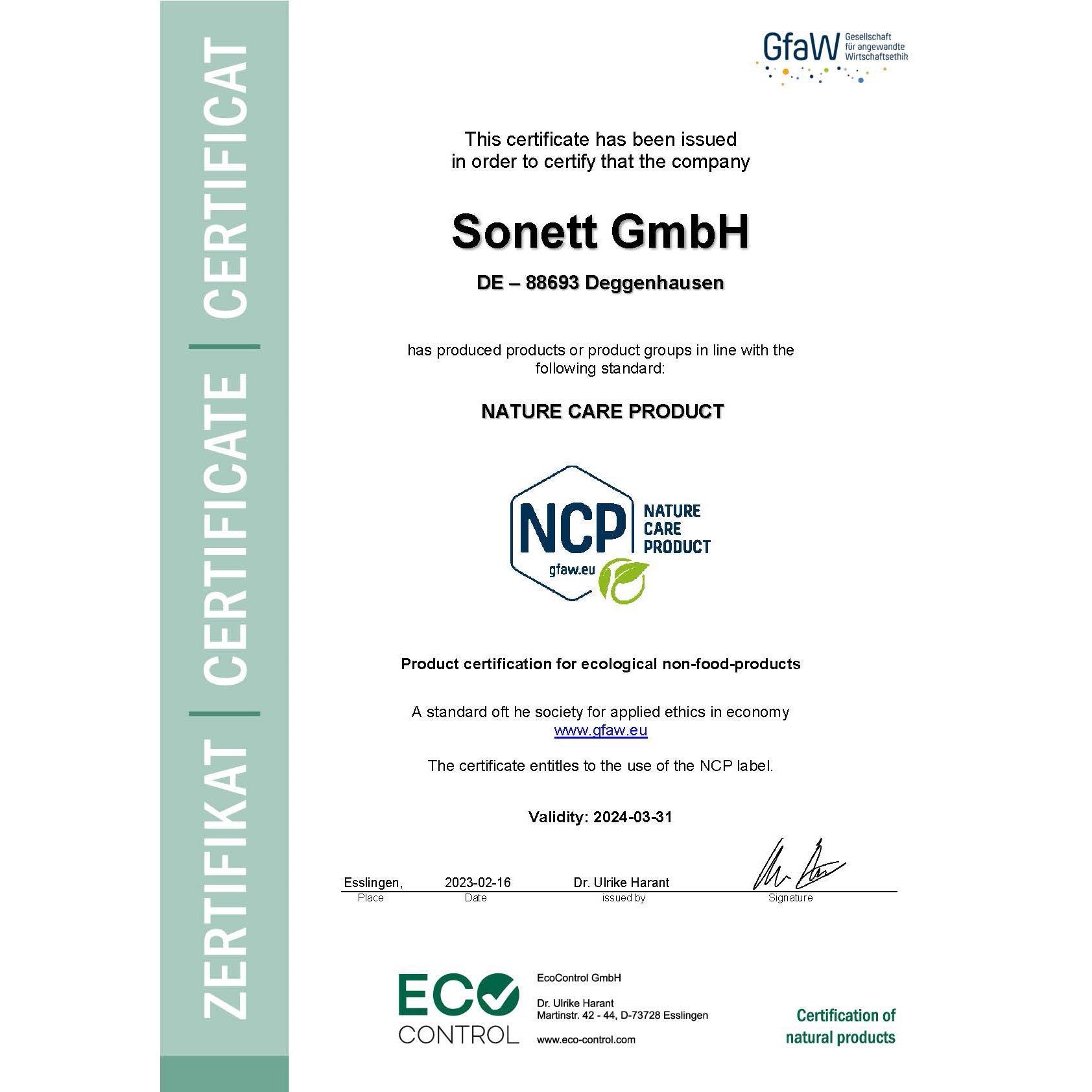 Sonett el sabunu dolgu, boya, koku, optik parlatıcı kullanmadan ve en önemlisi EDTA gibi petrokimyasal kompleks oluþturucular kullanýlmadan üretilmiþtir.